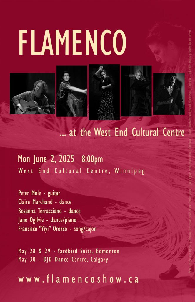 Flamenco singer and percussionist Francisco Orozco “Yiyi”, from Barcelona, Spain, joins leading Canadian Flamenco dancers and musicians, from across the Prairies to the west coast, for an intimate evening of Flamenco dance, guitar, piano, rhythm and song.